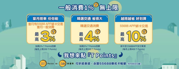以永豐 55688 聯名卡綁定至 55688 APP 並綁卡交易享最高10%回饋,每月上限 400 T Points。