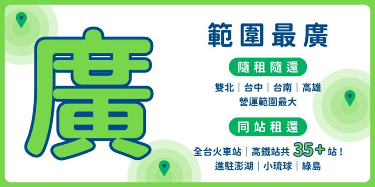 目前於雙北、台中、台南、高雄皆有隨租隨還,此外在全台火車站還有同站租還的模式!