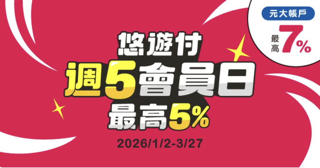 活動內容:每週五只要使用悠遊付,每筆加碼 2% 回饋,這 2% 還能跟月級挑戰的 3% 疊加,輕鬆達成 5% 高回饋!若使用悠遊付綁定元大帳戶扣款最高享 7% 回饋。(有名額限制需登錄)