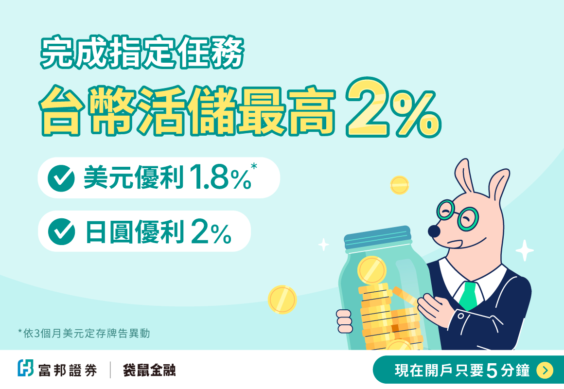 🎁 富邦證券戶約定北富銀數存帳戶交割,享台幣活儲最高 2%+美元優利 1.8%+日元優利 2%!
