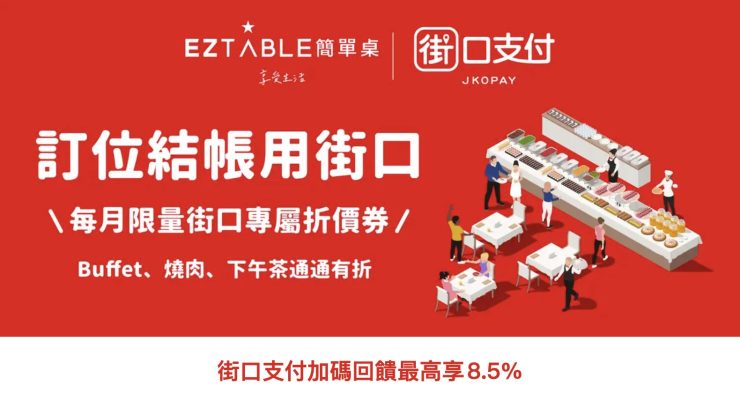 除了銀行優惠外,如果你習慣使用電子支付,街口支付在 2026 年 3 月推出的限時活動絕對不能錯過,回饋率最高直接衝上 8.5%!在 EZTABLE 結帳不僅能享有銀行回饋,還能疊加街口專屬的「月月領」折價券。這對大額餐飲消費(如慶生、家庭聚餐)來說,省下的錢非常有感。