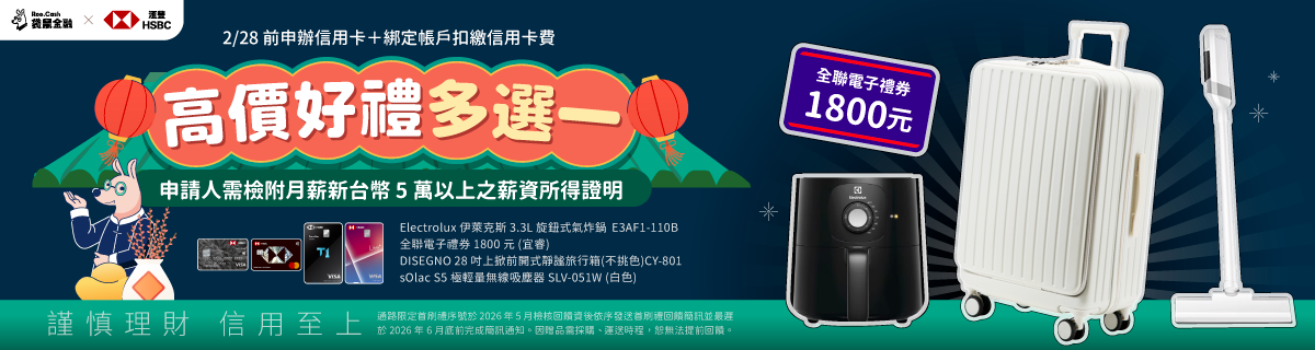 ![]() 運籌理財 One 能戶 了解更多 | ✔️ 最高活儲利率 2.4% ✔️跨提跨轉合計每月 30 次免費 ✔️ 2025/7/31 前新戶完成開戶+辦卡,享有首刷禮三選一及自動扣繳禮 ❍ Marshall 藍牙耳塞式耳機 MINOR IV ❍ DISEGNO 20+28 吋升級版胖胖箱兩件組(不挑色) ❍ 全聯電子禮券 2,200 元(宜睿) ❍ Philips 旋鈕式海星3.2L氣炸鍋 NA110(不挑色) | 🔺 開戶任務 ⚑ 透過袋鼠金融線上申請滙豐Live+現金回饋卡、匯鑽卡或現金回饋御璽卡 ⚑ 申請後 45 天內核卡 ⚑ 核卡30天內註冊登入滙豐銀行信用卡行動App(HSBC Card+) ⚑ 將本帳戶設定為信用卡自動扣繳帳戶 ⚑ 勾選電子帳單或行動帳單 ⚑新增一般消費累積達$5,000元 |