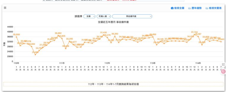 根據交通部路政及道安司所公開的事故統計資料,110 年到 114 年死傷的事故總件數,在年底與年初都特別高,這個時期也正是年底節慶、年初農曆新年的時候。