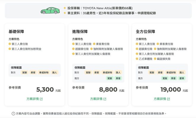 上述提到的保障內容,都能在國泰產險汽車險自由搭配!國泰產險汽車險線上投保,提供基礎、進階與全方位保障三種方案,不僅涵蓋第三人責任險,超額責任險保額最高還有 1,000 萬元,車主都能依照個人需求來選擇。