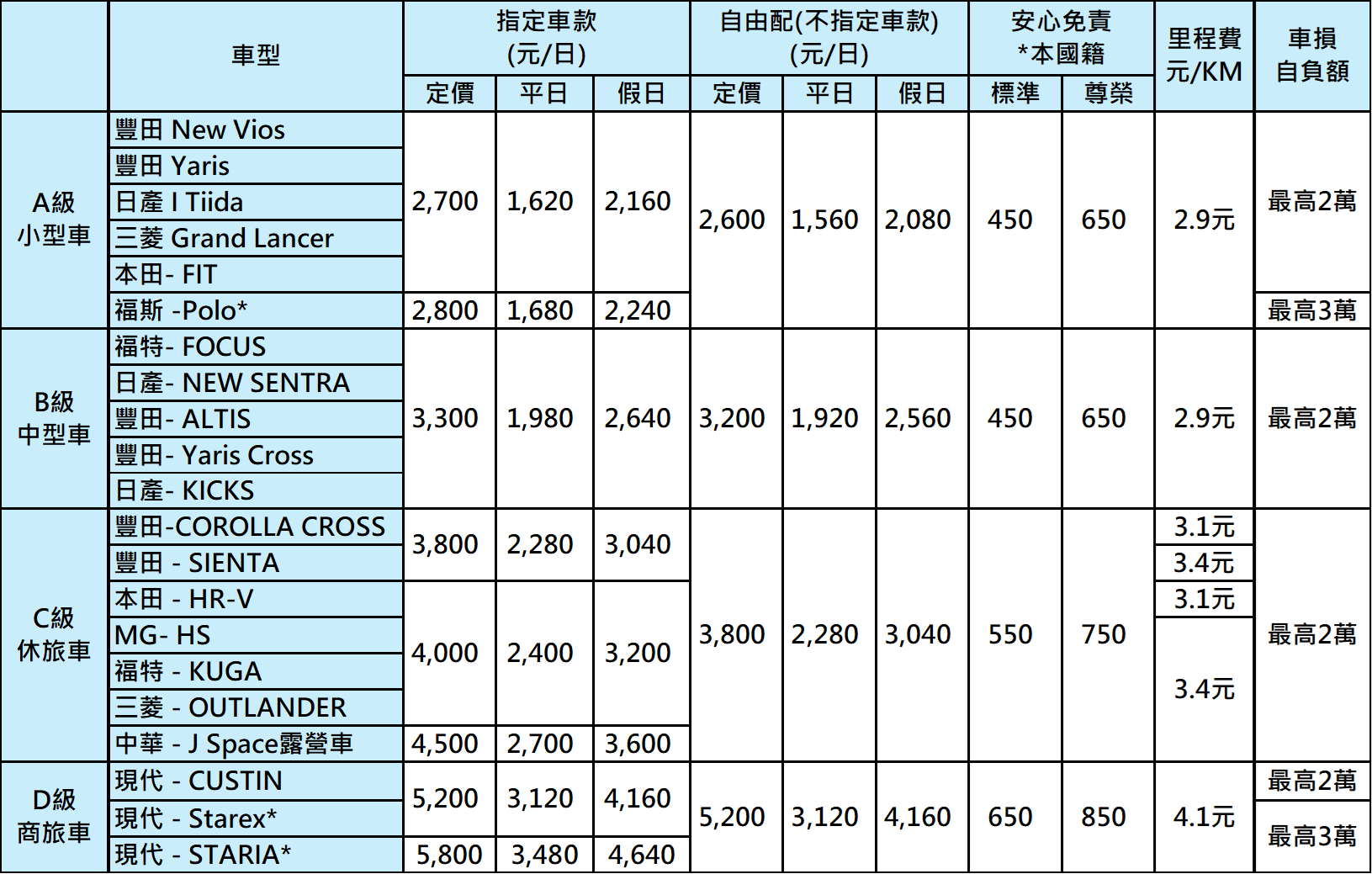 | 格上租車 | NT$ 1,560 ~ 2,800 | NT$ 1,920 ~ 3,300 | NT$ 2,280 ~ 4,500 | NT$ 2.9 ~ 4.1 元/KM | 需付費 | 車型最多元、租車送保險、配件齊全 |