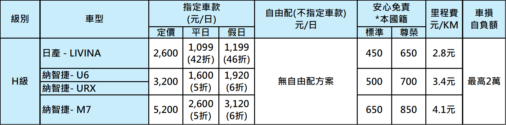 - 納智捷 M7(七人座)日租金平日 5 折(NT$ 2,600 /日);假日 6 折(NT$ 3,120 /日)。