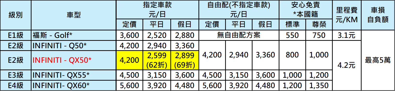 - INFINITI QX50 日租金平日 62 折(NT$ 2,599 元/日);假日 69 折(NT$ 2,899 元/日)。
