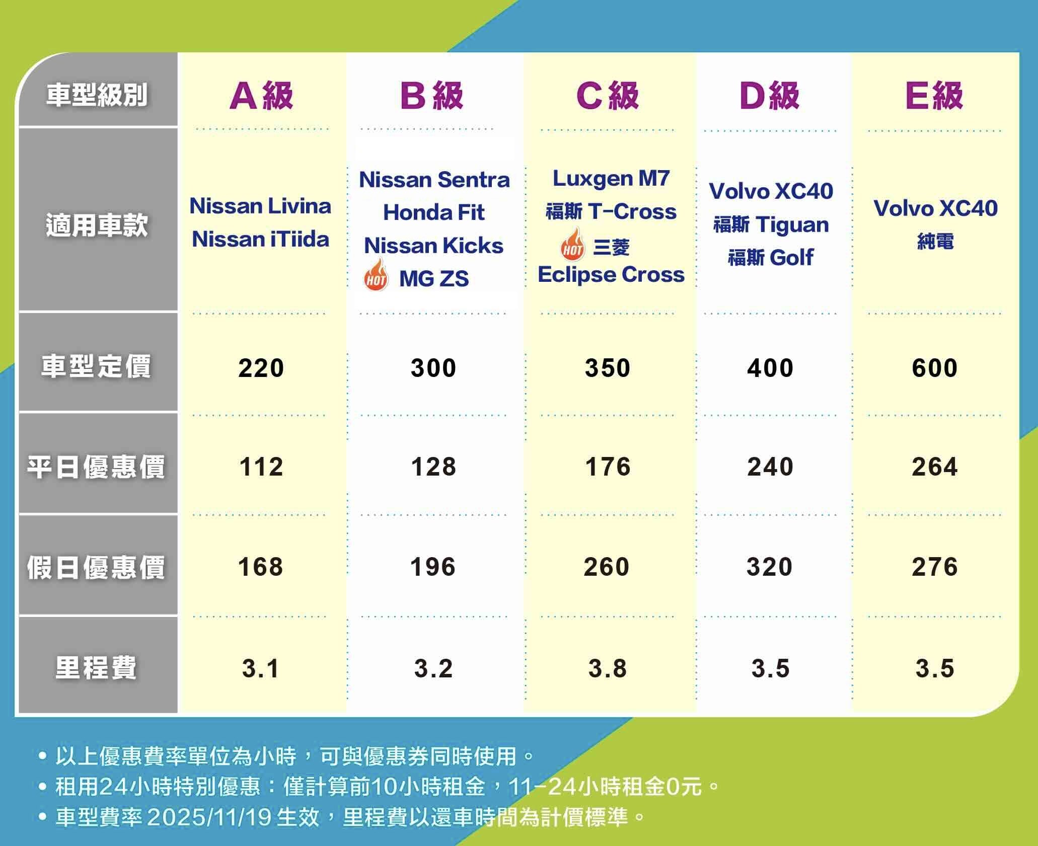 - 異站租還:12/25 ~ 12/28 單次承租達 30 小時,享 A 級車折抵 $ 56/時、B 級車折抵 $ 64/時,單日優惠上限 10 小時