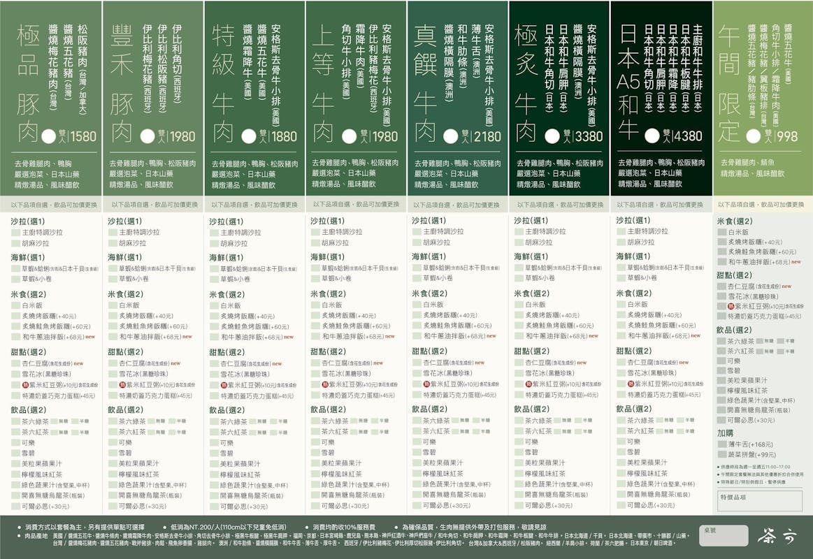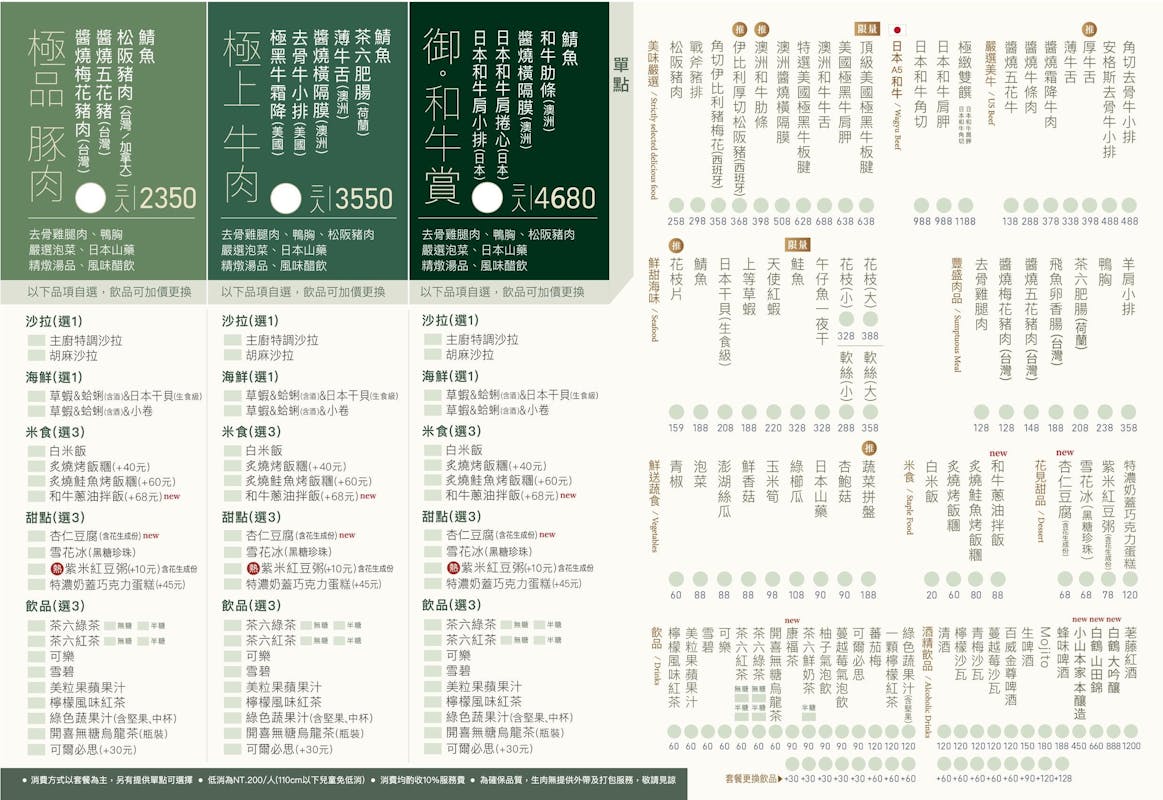 豐禾豚肉雙人套餐 (NT$1,980): 以伊比利豬肉系列為主菜,包含伊比利梅花、松阪及角切三種部位;副餐同樣有雞腿肉、鴨胸、松阪豬、泡菜、山藥、鮭魚味噌湯與醋飲等,可嚐遍豬肉風味。