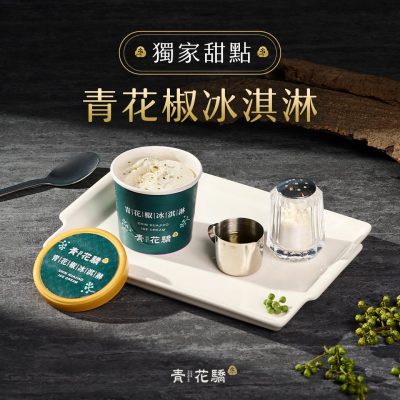 將香草冰淇淋撒上現磨青花椒粒,再淋上青花椒油,帶來獨特的麻香體驗,是一款極具創意又令人驚喜的甜點。結合鹹甜香的口感層次,是全台首創的創意甜點,味道平衡,不突兀,連怕辣的人也能安心嘗試。