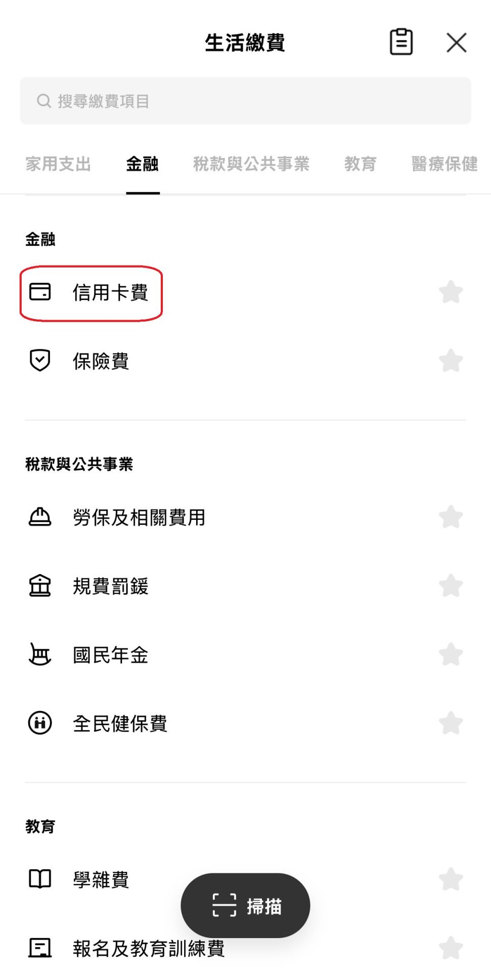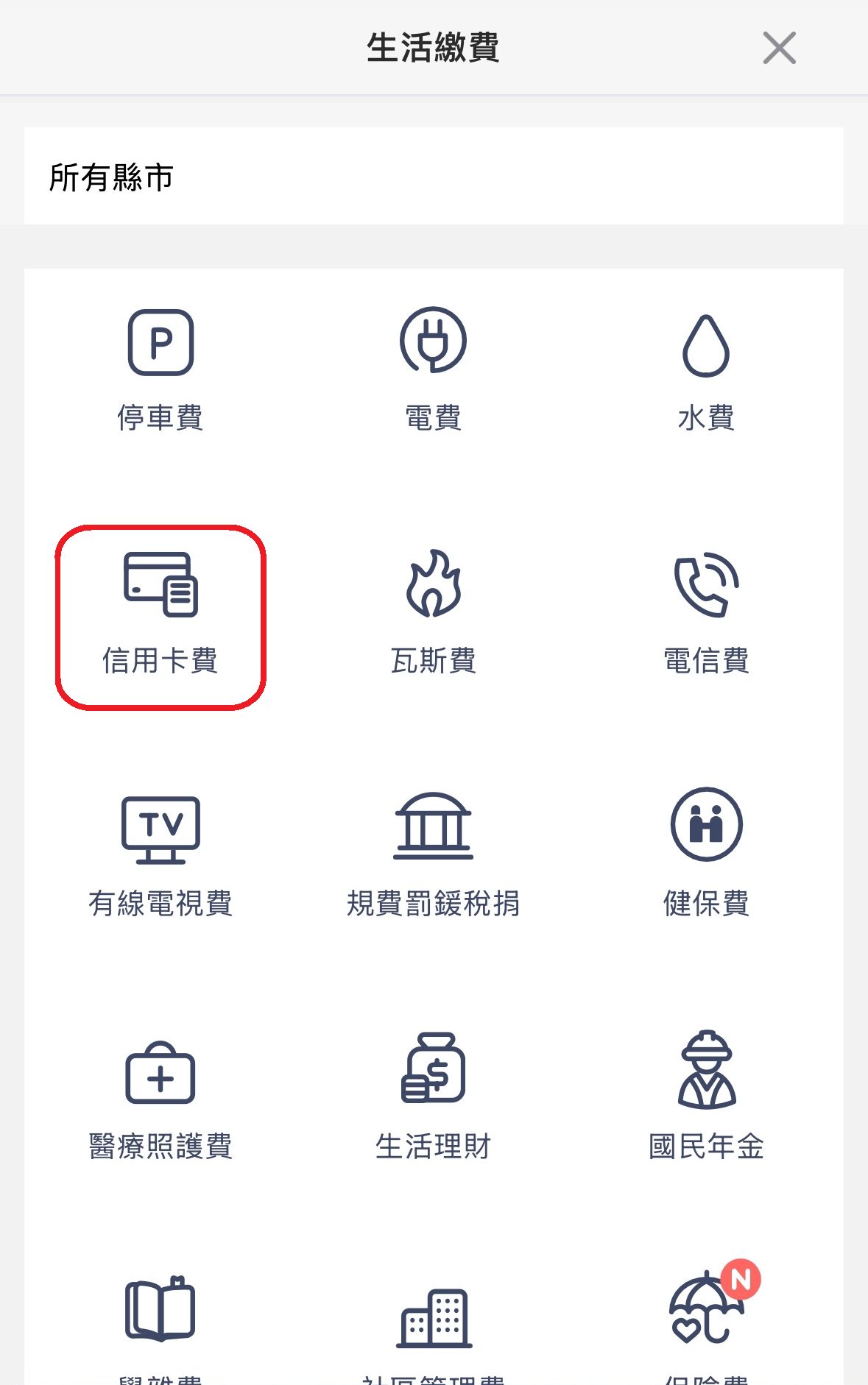 接著進入生活繳費專區後,點選「信用卡費」後選擇自己信用卡的銀行,並跟隨後續步驟走,即可使用 LINE Pay Money 繳交卡費: