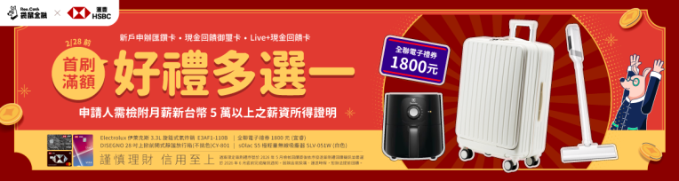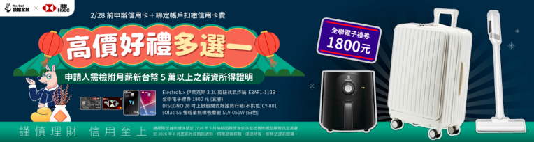 滙豐 匯鑽卡立即申請 | 🚩 行動支付+網購外送+線上訂房+影音遊戲面面俱到!現金回饋翻倍最高6%! ✨ 行動支付最迅速:街口支付、PAYPAL,日常回饋超有感! ✨ Amazon.com、HERMES,歐美日韓摯愛潮牌一網打盡! ✨ Agoda、Booking.com,訂房網站任你挑! 🎁 袋鼠限定!2026/02/28 前透過專屬連結申辦,符合條件即享好禮! ✨ sOlac S5 極輕量無線吸塵器 SLV-051W(白色) ✨ 全聯電子禮券 1,800 元(宜睿) ✨ Electrolux 伊萊克斯 3.3L旋鈕式氣炸鍋 E3AF1-110B ✨ DISEGNO 28 吋上掀前開式靜謐旅行箱(不挑色)CY-801 |