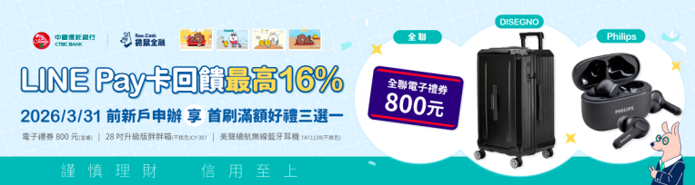 台新 Richart卡立即申請 | 🚩 台新 Richart 卡新戶首刷好禮 4 選 1!最高 3.8% 回饋!LINE Pay 綁定支付享 2.3%! ✨ 七大優惠權益天天自由換! ✨ 綁定台新Pay享11萬家通路 3.8%!LINE Pay 綁定支付享 2.3% 回饋! ✨ 超商旅遊網購等超多通路盡享優惠! 🎁 袋鼠限定!2026/02/28 前透過專屬連結申辦,符合條件即享好禮! ✨ 全聯電子禮券 1,800元 ✨ SONY 索尼 無線藍牙喇叭 ✨ Bruno 寶可夢單板熱壓三明治機 BOE131(不挑色) ✨ American Explorer 30吋 PN5 胖胖箱/運動箱 |