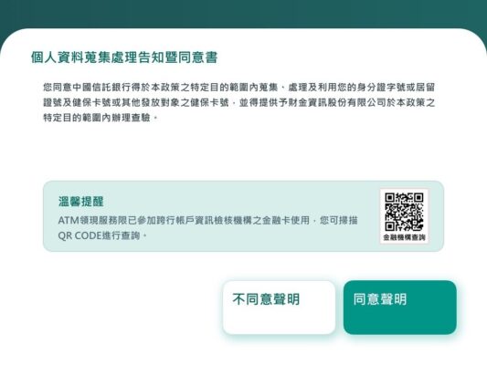 2.於個人資料蒐集處理告知暨同意書頁點選「同意聲明」選項進行下一步驟。