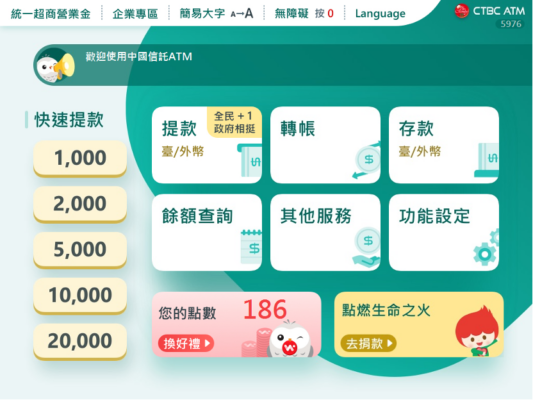 1.插入金融卡,使用台灣任一銀行發行的晶片金融卡都可,點選「提款-全民+1 政府相挺」。