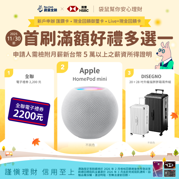 | 🔥 活動期間 🔥 2025/11/01~2025/11/30 ❍ 完成指定條件即享好禮 3 選 1 ❍ 🎁 Apple HomePod mini(不挑色) 🎁 全聯電子禮券 2,200 元 🎁 DISEGNO 20+28 吋升級版胖胖箱兩件組(不挑色) ✨ 指定任務 ✨ ⚑ 透過袋鼠金融指定連結申請 ⚑ 並於申請日期後 45 天內完成核卡 ⚑ 於核卡 30 天內新增一般消費累積達 $5,000 元 ⚑ 勾選行動帳單或電子帳單 | |