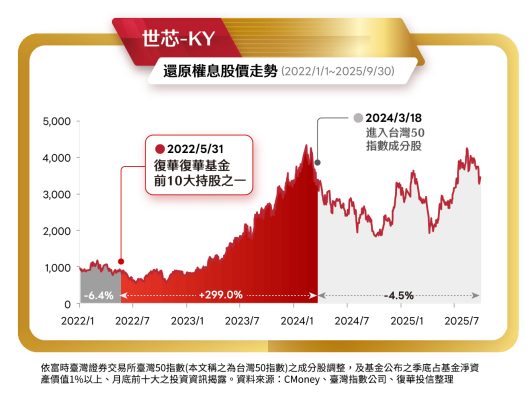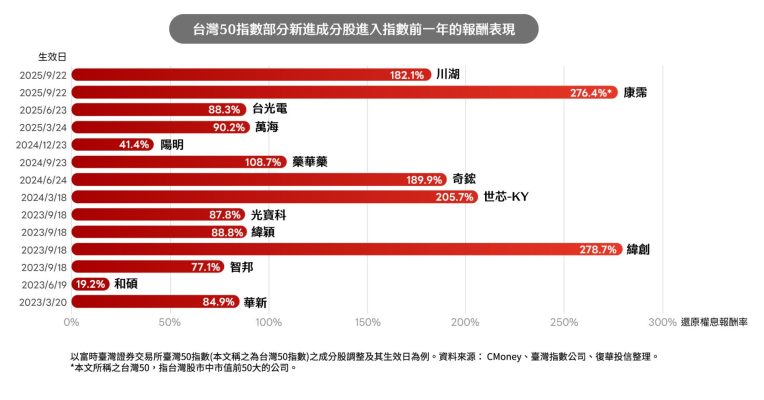 因為我們想要享受股價漲幅超甜美的那一段。舉例:比如說像是台光電,在加入市值前50的前一年漲幅就高達八成以上;另外一檔股票世芯-KY,在加入市值前50的前一年漲幅高達200%,相信投資人也很希望在我們未來買的ETF裡面有這樣子的成分股,我們也會努力的去找尋未來台灣50的標的。