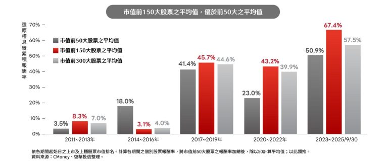 針對「布局台股該如何挑選標的」的問題,呂宏宇指出,根據復華投信統計,自2011年以來,以三年為區間觀察各市值群組的股票還原權息後累積報酬率,可以發現:從市值前150大企業中選股的勝率明顯較佳。以2023年以來為例,市值前150大股票的平均累積報酬率達67.4%,優於市值前50大的平均50.9%。