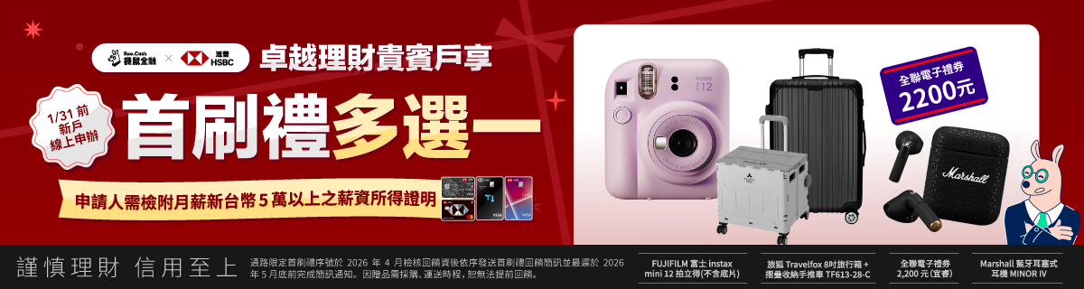 滙豐 匯鑽卡立即申請 | 🚩 行動支付+網購外送+線上訂房+影音遊戲面面俱到!現金回饋翻倍最高6%! ✨ 行動支付最迅速:街口支付、PAYPAL,日常回饋超有感! ✨ Amazon.com、HERMES,歐美日韓摯愛潮牌一網打盡! ✨ Agoda、Booking.com,訂房網站任你挑! 🎁 袋鼠限定!2026/01/31 前透過專屬連結申辦,符合條件即享好禮! ✨ Marshall 藍牙耳塞式耳機 MINOR IV ✨ 全聯電子禮券 2,200 元(宜睿) ✨ Travelfox 旅狐 28吋旅行箱 + 摺疊收納手推車組 TF613-28-C ✨ FUJIFILM 富士 instax mini 12 拍立得(不挑色) |