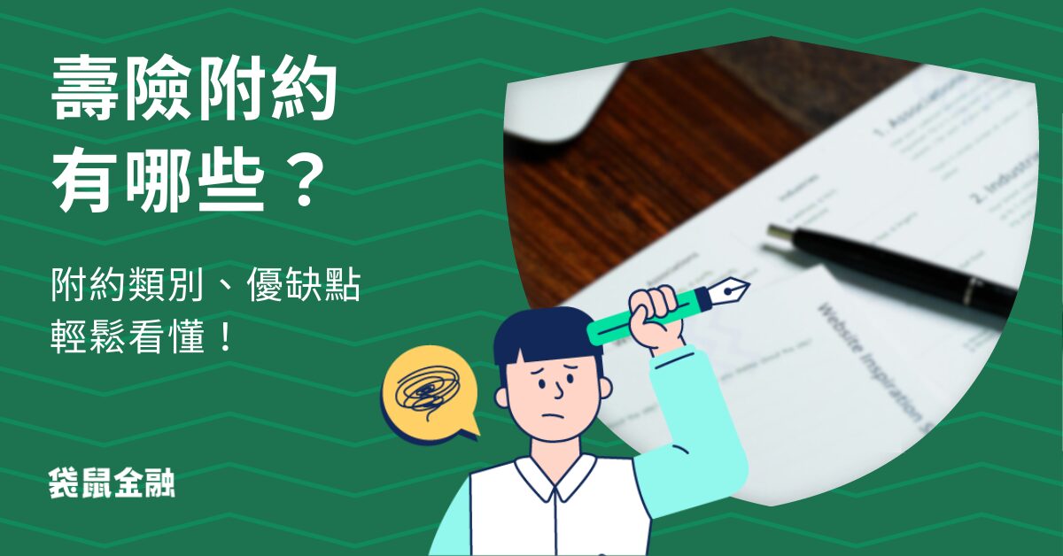 袋鼠金融導讀|想了解壽險附約怎麼選?別擔心,在這篇文章中,我們將深入解析壽險附約是什麼,包括常見的壽險附約類型與市面上的熱門壽險附約產品。同時也會介紹壽險附約的優缺點、投保注意事項與常見問題,幫助有興趣的朋友可以更快地掌握壽險附約的關鍵資訊,選擇最適合自己的保險組合,讓保險規劃更安心、更完整。除了壽險附約之外,如果還想了解更多壽險與保險相關資訊,也可以看看〈壽險懶人包〉、〈定期壽險攻略〉、〈投保紀錄查詢指南〉唷!