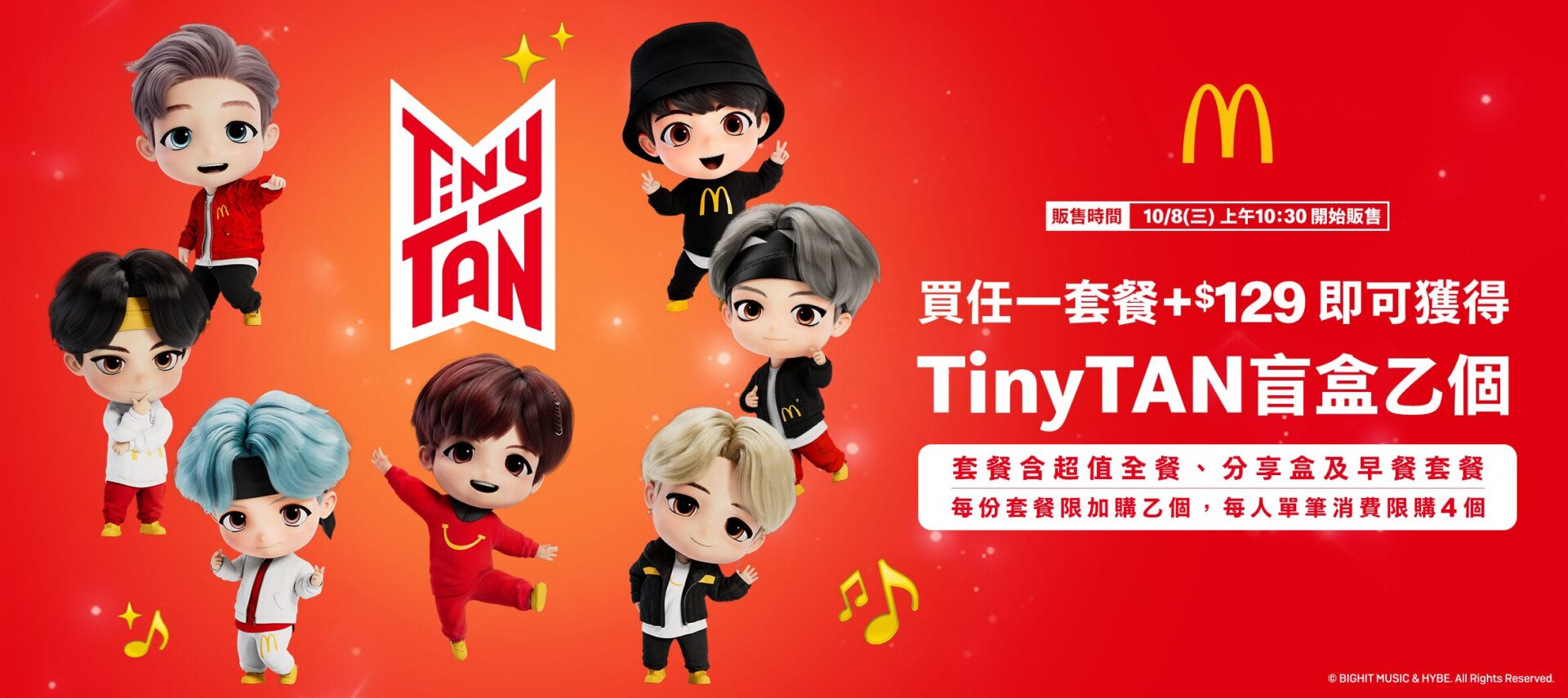 • 於麥當勞店內購買任一超值全餐、分享盒、早餐套餐加 NT$ 129 元,即可獲得「TinyTAN 盲盒」乙個(內含隨機TinyTAN公仔 1 個及角色卡 1 張),每份超值全餐、分享盒、早餐套餐限加購乙個,每人(不限年齡)每次消費最多限購四個