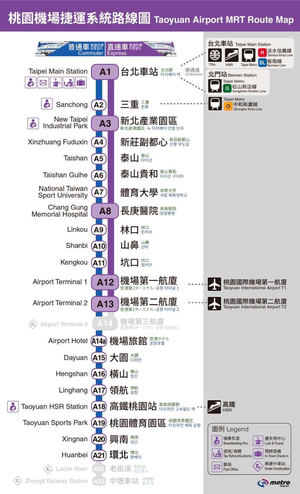 A1 台北車站 → A2 三重站 → A3 新北產業園區站 → A4 新莊副都心站 → A5 泰山站 → A6 泰山貴和站 → A7 體育大學站 → A8 長庚醫院站 → A9 林口站 → A10 山鼻站 → A11 坑口站 → A12 機場第一航廈站 → A13 機場第二航廈站 → A14a 機場旅館站 → A15 大園站 → A16 橫山站 → A17 領航站 → A18 高鐵桃園站 → A19 桃園體育園區站 → A20 興南站 → A21 環北站 → A22 老街溪站