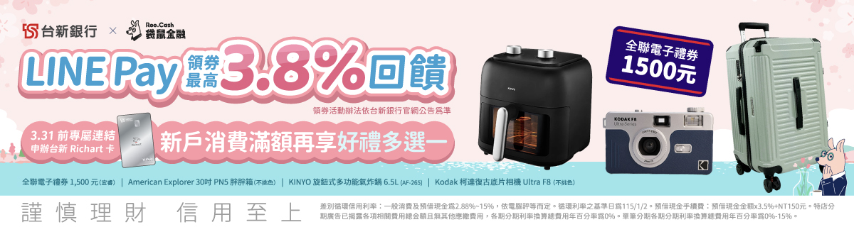 台新 Richart卡立即申請 | 🚩 台新 Richart 卡新戶首刷好禮 4 選 1!最高 3.8% 回饋!LINE Pay 綁定支付享 2.3%! ✨ 七大優惠權益天天自由換! ✨ 綁定台新Pay享11萬家通路 3.8%!LINE Pay 綁定支付享 2.3% 回饋! ✨ 超商旅遊網購等超多通路盡享優惠! 🎁 袋鼠限定!2026/03/31 前透過專屬連結申辦,符合條件即享好禮! ✨ Kodak 柯達 復古底片相機 Ultra F8 ✨ KINYO 旋鈕式多功能氣炸鍋6.5L ✨ American Explorer 30吋 PN5 胖胖箱(不挑色) ✨ 全聯電子禮券 1,500 元(宜睿) |