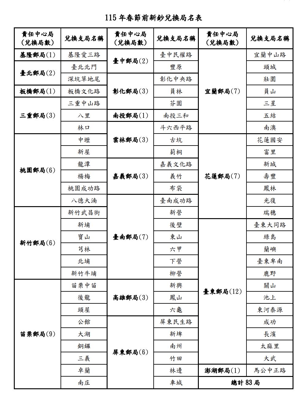 中華郵政公布以下 83 個地點,提供民眾更換新鈔: