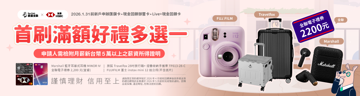 滙豐 匯鑽卡立即申請 | 🚩 行動支付+網購外送+線上訂房+影音遊戲面面俱到!現金回饋翻倍最高6%! ✨ 行動支付最迅速:街口支付、PAYPAL,日常回饋超有感! ✨ Amazon.com、HERMES,歐美日韓摯愛潮牌一網打盡! ✨ Agoda、Booking.com,訂房網站任你挑! 🎁 袋鼠限定!2026/01/31 前透過專屬連結申辦,符合條件即享好禮! ✨ Marshall 藍牙耳塞式耳機 MINOR IV ✨ 全聯電子禮券 2,200 元(宜睿) ✨ Travelfox 旅狐 28吋旅行箱 + 摺疊收納手推車組 TF613-28-C ✨ FUJIFILM 富士 instax mini 12 拍立得(不挑色) |