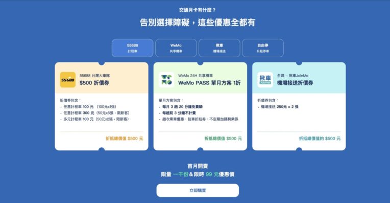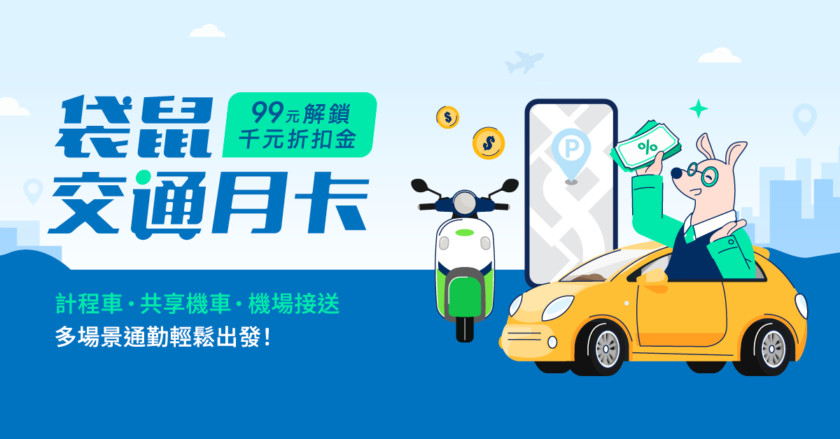 如果你平常習慣叫車、租共享機車、開車停月租,或經常需要機場接送,這張交通月卡能讓原本分散的交通費用集中管理,輕鬆把固定支出壓下來,且一個月只要 99 元,就可以獲得千元價值的交通優惠!