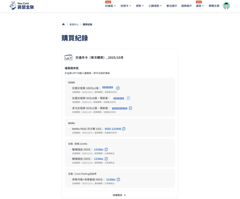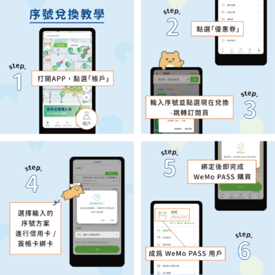 接著,只要前往各合作平台(App 或官網)輸入序號即可折抵,目前交通月卡合作的通路包括 55688、WeMo Scooter、全鋒揪車JoinMe 及Cross Parking 自由停。