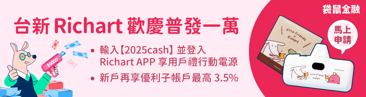 |  Richart 數位帳戶 了解更多 | ✔️最高活儲利率 3.5% ✔️國內、國外每月皆享各5次跨提跨轉免手續費優惠 ✔️2026/01/05 前開戶並登錄完成任務四選一,享有任務獎勵 ❍ 新戶新臺幣活儲年利率最高3.5%! ❍ 舊戶享Richart優利子帳戶新臺幣30萬元以內1.8%年利率! | 🔺 開戶任務 ⚑ 任務一「新臺幣存滿額」:每月任七個營業日主帳戶存款餘額達10萬元以上 ⚑ 任務二「外幣存滿額」:Richart 外幣活存餘額達美元2,000元以上或日圓250,000元以上 ⚑ 任務三「預約定期定額存股」:於Richart App預約設定任一筆台股定期定額交易且證券交割帳戶扣款成功 ⚑ 任務四「開啟新功能」:將Richart新臺幣活期儲蓄存款帳戶(主帳戶)設定為備用金授權扣款帳戶。 |