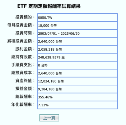 我們以每月 5 日定期扣款 NT$ 10,000 試算,模擬從 2005 / 7~2025 / 6 的期間持續定期定額購入 0050 且股利皆會再投資。在這樣的設定下總報酬率超過 350%,且平均年化報酬率也來到了 7.13%。