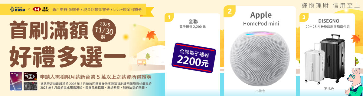 |  滙豐 匯鑽卡 立即申請 | 🚩 行動支付+網購外送+線上訂房+影音遊戲面面俱到!現金回饋翻倍最高6%! ✨ 行動支付最迅速:街口支付、PAYPAL,日常回饋超有感! ✨ Amazon.com、HERMES,歐美日韓摯愛潮牌一網打盡! ✨ Agoda、Booking.com,訂房網站任你挑! 🎁 袋鼠限定!2025/09/30 前透過專屬連結申辦,符合條件即享好禮! ✨ KINYO 半自動義式奶泡咖啡機 ✨ Cool One 24 吋 1:9 上掀式旅行箱 + 手推車組合 ✨ 全聯電子禮券 1,800 元 |