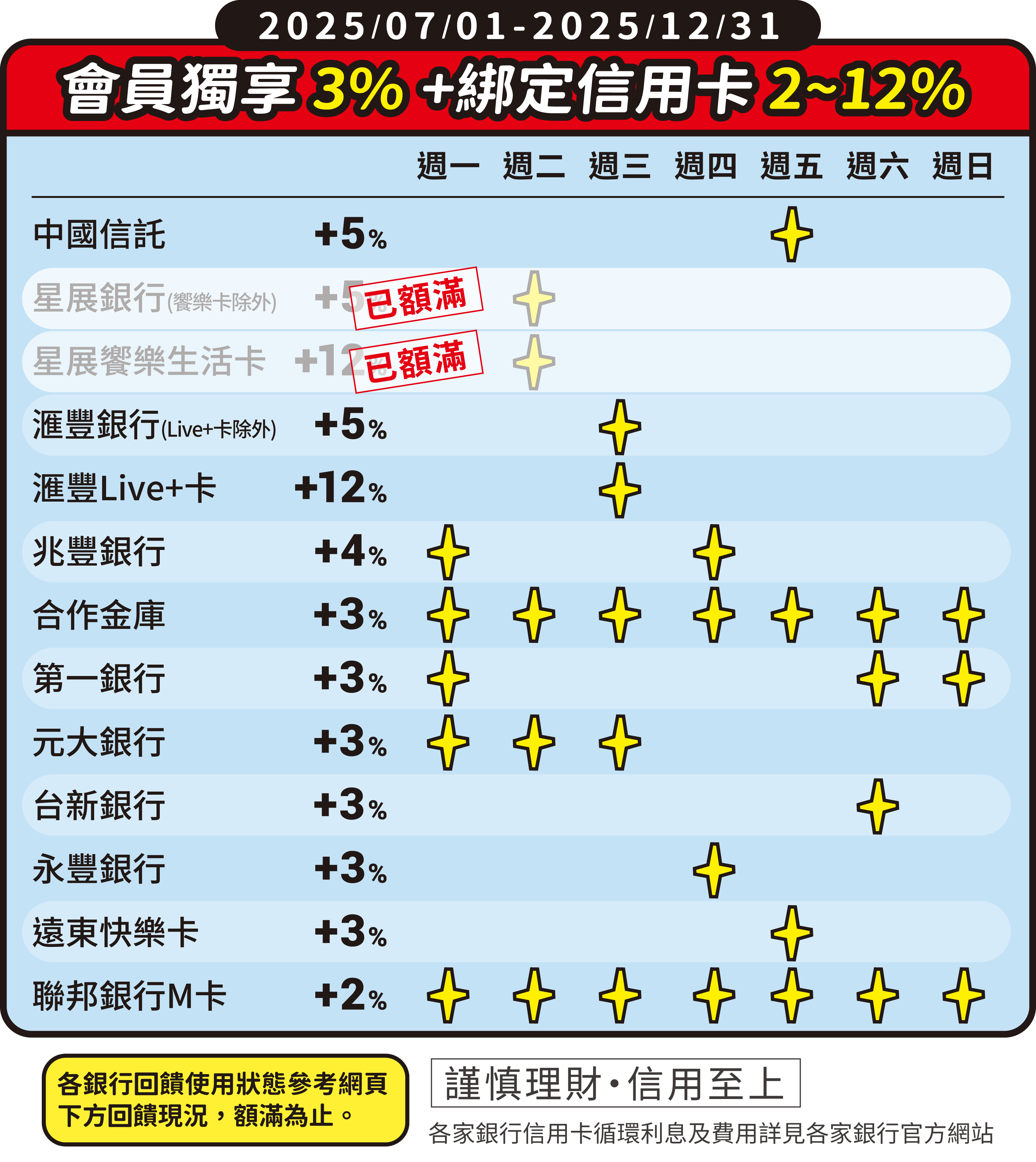 - 會員每週二用餐,使用王品瘋美食 App「瘋 Pay」錢包綁定刷星展銀行「信用卡」,享 3% 瘋點數回饋。(饗樂生活卡除外)(已額滿)